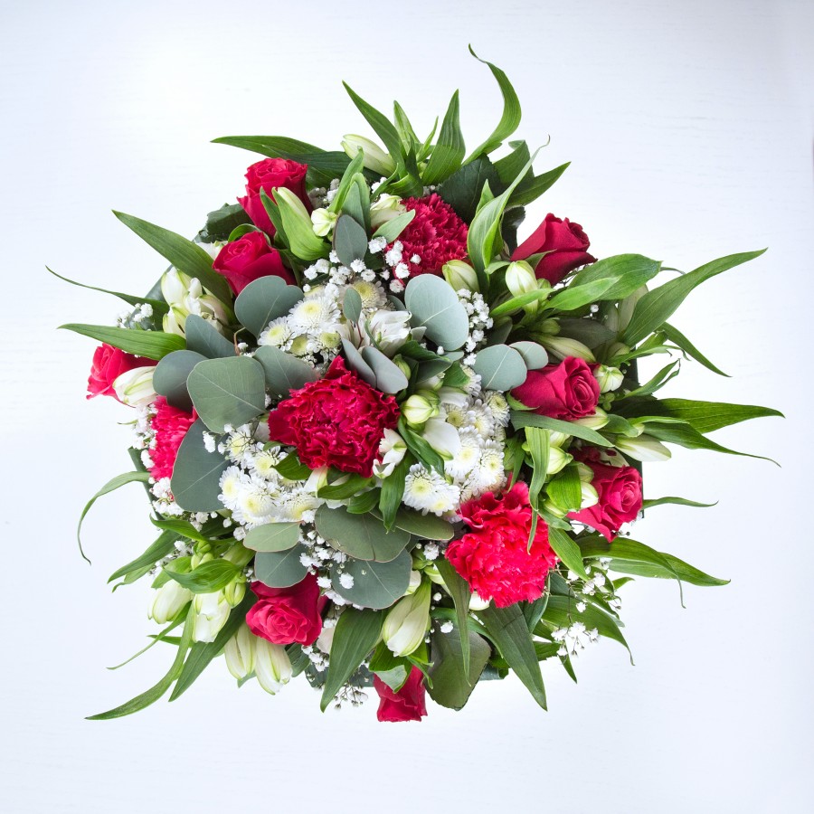 Experience the stunning allure of our mixed rose bouquet, crafted to perfection. This beautiful arrangement features sweet white chrysanthemums, delicate gypsophila, opulent red roses, lively carnations, pristine white alstroemeria, and lush aspidistra leaves, all thoughtfully combined to create a breathtaking display.